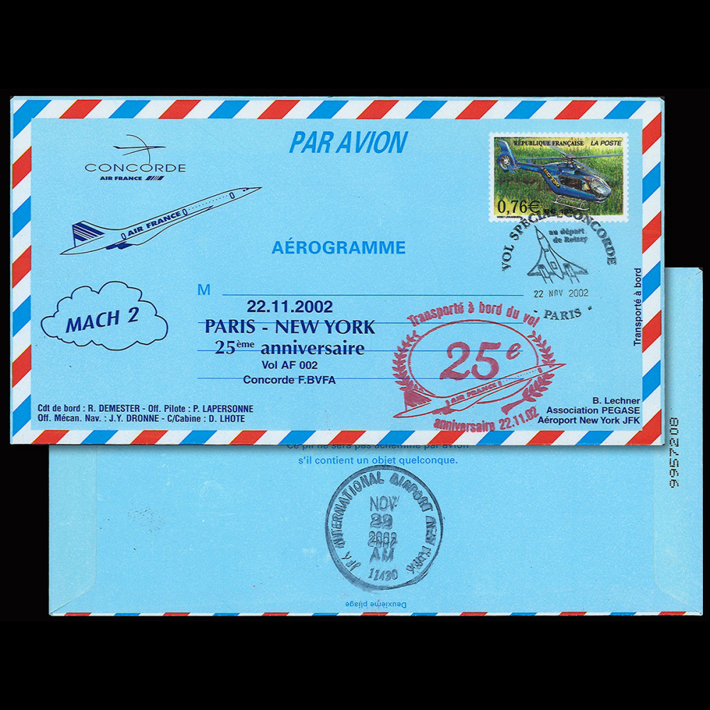 Plusieurs plis aérophilatéliques ont refait le même voyage à bord de Concorde, à 25 années d'intervalle, en commémoration de ces premiers vols historiques du 22 novembre 1977. Conçues par Historiaphil© (Kiosque de Philatélie du Parlement européen, Strasbourg, France) des enveloppes spéciales ont été postées depuis la session plénière de Strasbourg du Parlement européen. Elles ont été réalisées dans la continuité de la collection des enveloppes philatéliques témoignant depuis 1949, de l'histoire de l'Europe et de ses institutions. Leur tirage est limité et numéroté.