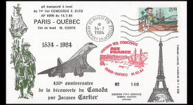 - Cachet bleu d'authentification du vol Concorde "Premier Vol Concorde Air France Québec - Montréal 14.07.1984"