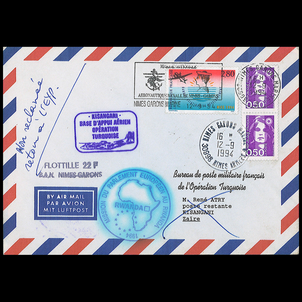 - cachet violet "Kisangani - Base d'Appui Aérien - OPERATION TURQUOISE" (Zaïre)