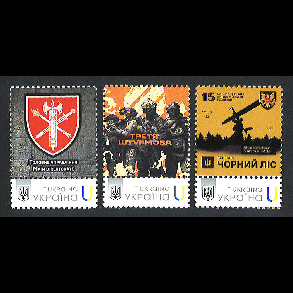 UKR25-BAT1 : timbres personnalisés Ukraine 2025 - 3 valeurs “U“ (tarif lettre) "Brigades des Forces Armées Ukrainiennes"