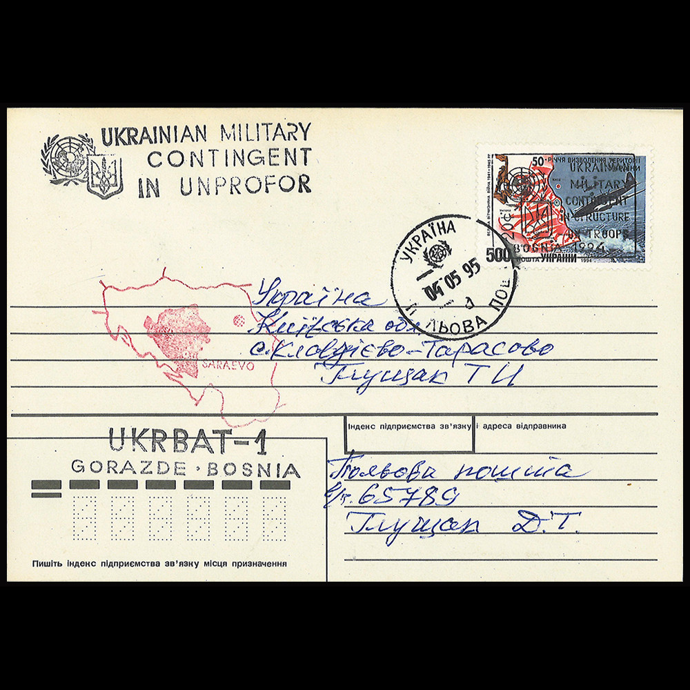 - 3 cachets spéciaux “UNPROFOR“, “Carte de Bosnie, Sarajevo“, “UKRBAT-1 Gorazde-Bosnia“