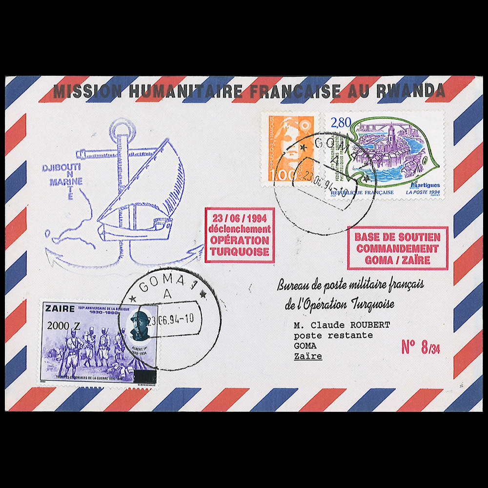 - Oblitération : Ce courrier, affranchi de timbres français, n’a pas été oblitéré au départ, la base de Djibouti utilisant des timbres Malgaches. De ce fait, les timbres français ont été oblitérés à l’arrivée avec le cachet postal de GOMA 23.06.1994 (Zaïre), accueillant la Base française de commandement de “l’Opération Turquoise“.