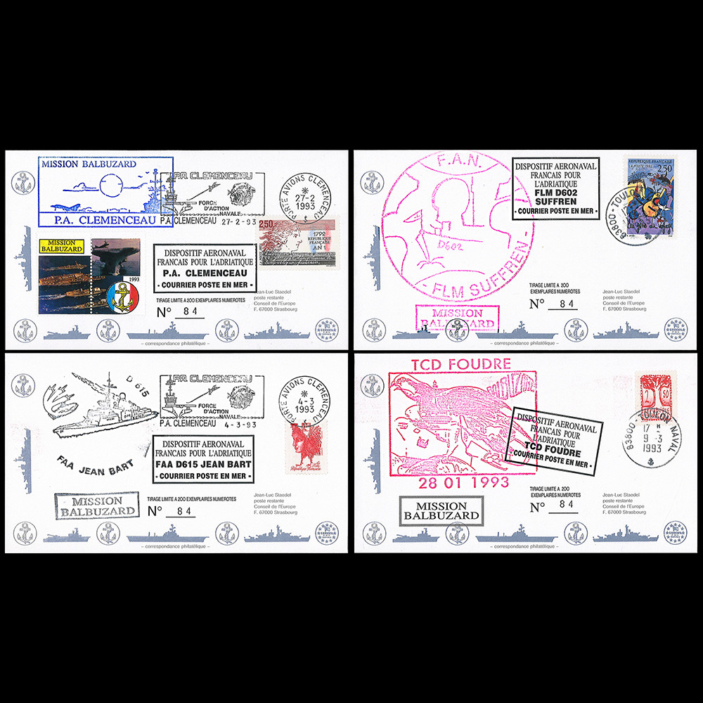 N°BALB2/5 : série de 4 plis poste navale Marine Nationale France «Guerre en ex-Yougoslavie - Mission Balbuzard 1993 - Dispositif aéronaval français pour l’Adriatique» postés à bord avec cachets d’authentification