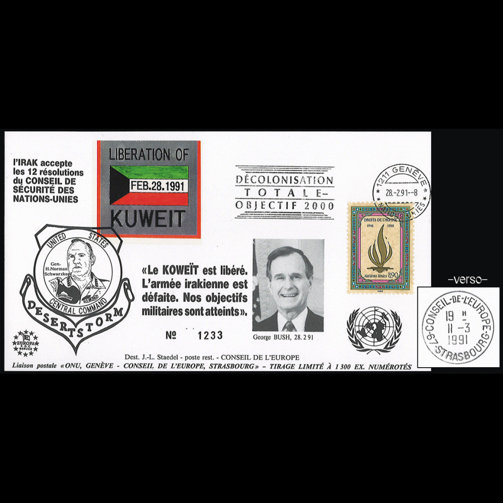 - cachet noir "Général H. Norman SCHWARZKOPF, USA - Commandant en Chef de l'Opération DESERT STORM"