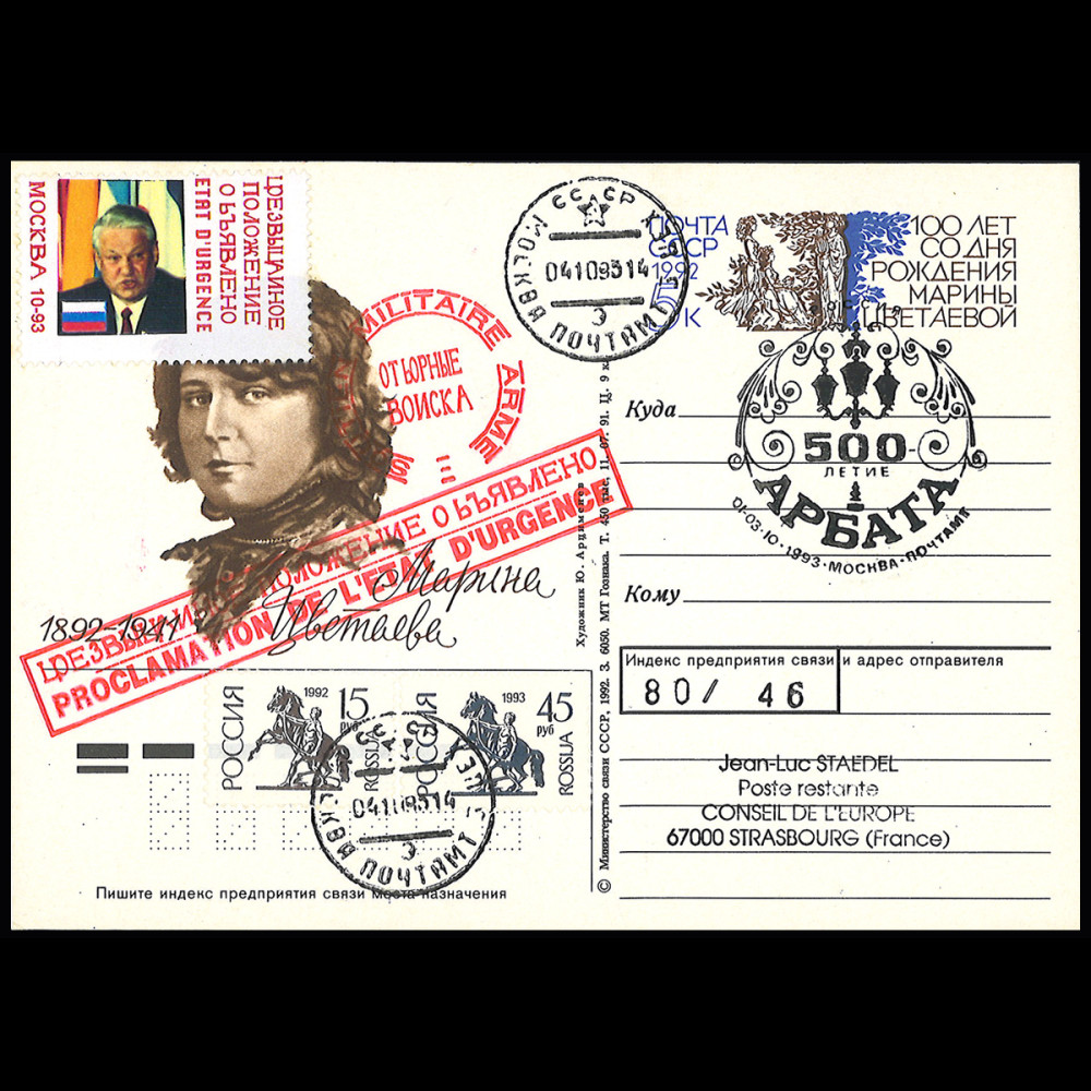 N°MOS1LC : Entier postal RUSSIE (carte) “INSURRECTION À MOSCOU (Quartier Arbat) 1-4 octobre 1993 - Centenaire de la poétesse russe Marina Tsvetaïeva“