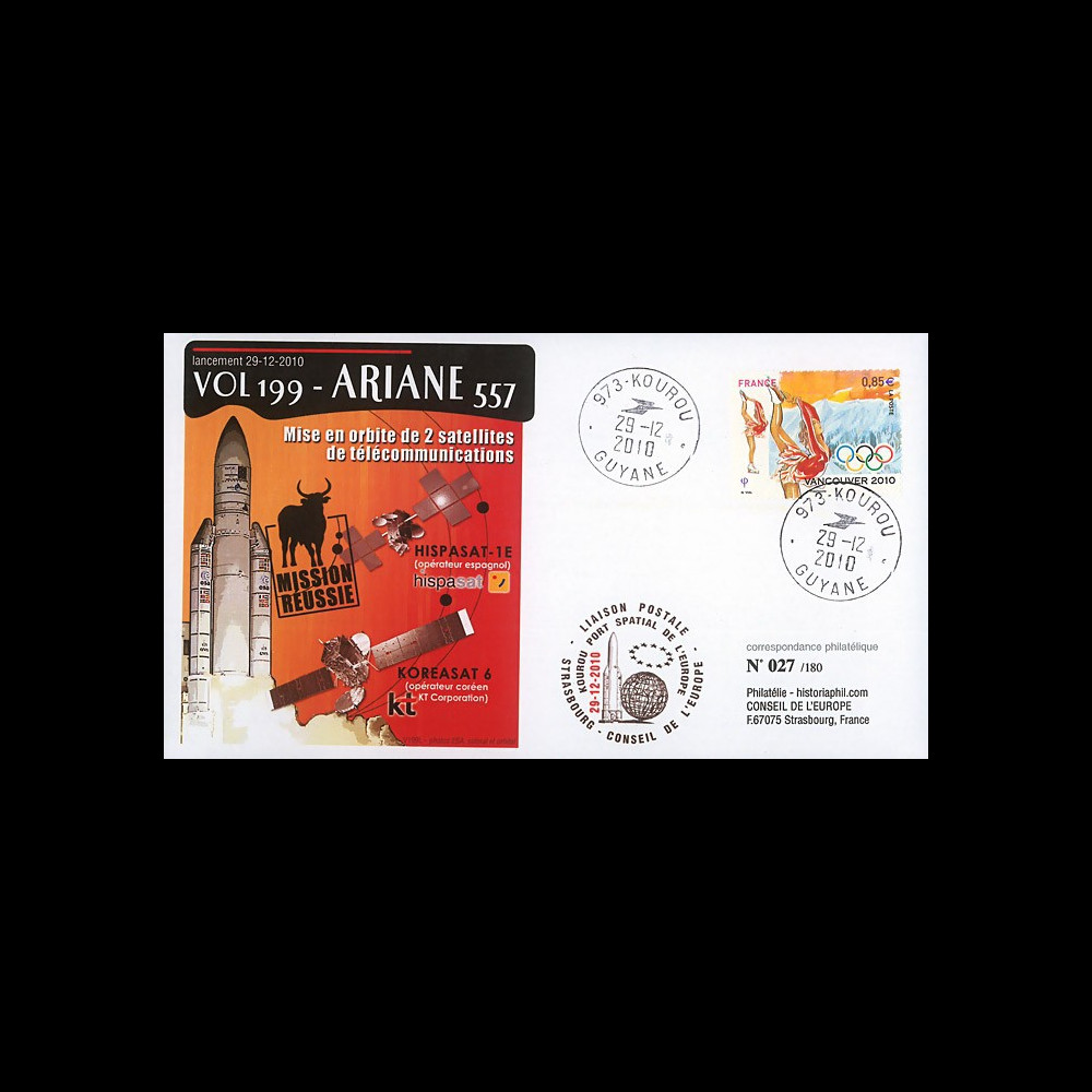 29.12.2010 : Pour son 6e lancement de l’année, Arianespace a mis en orbite deux satellites de télécommunications : Hispasat 1E pour l’opérateur espagnol Hispasat et KOREASAT 6 pour l’opérateur coréen Korea Telecom Corporation.