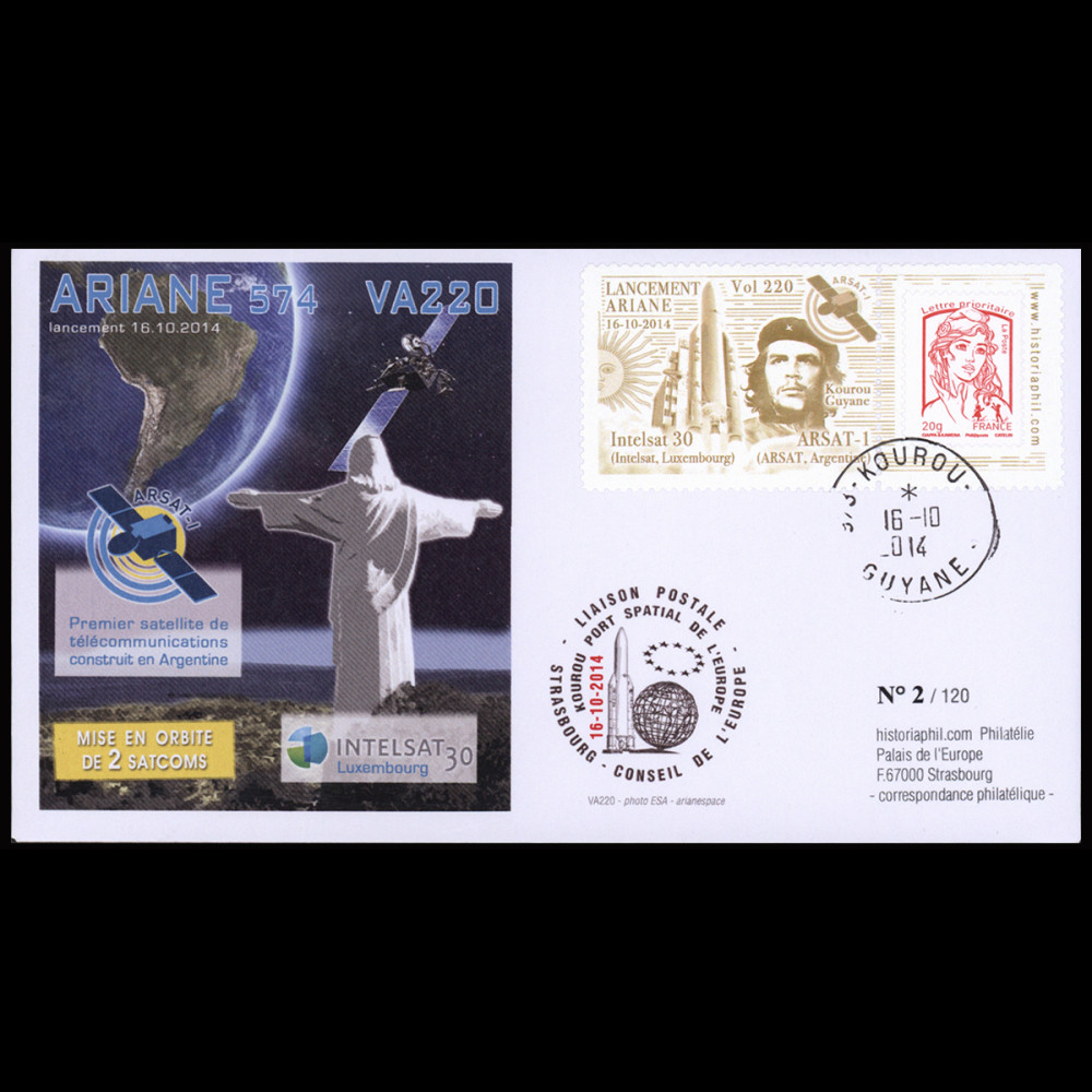 Affranchissement TYPE 1 : France 1 valeur Lettre prioritaire 20g rouge "Marianne et la Jeunesse, 2014" sur porte-timbre "Kourou (Guyane), 16.10.2014 : Lancement Fusée Ariane - Vol n°220 / Satellites de télécommunication Intelsat-30 & Arsat-1 / Che Guevara"
