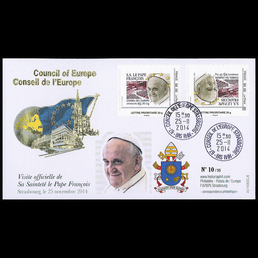 CE65V-3V : FDC (enveloppe) France Edition Prestige "25.11.2014 : Visite officielle de Sa Sainteté le Pape François au Conseil de l'Europe de Strasbourg - TYPE 3 Lettre prio rouge à VARIÉTÉ TÊTE-BÊCHE"