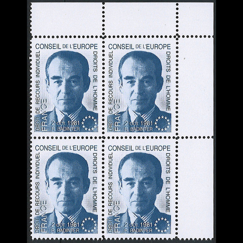 CE33-IIV : Bloc de 4 vignettes dentelées "Conseil de l'Europe - Droit de recours individuel, France - Droits de l'Homme - France 2 oct. 1981 - R. Badinter"