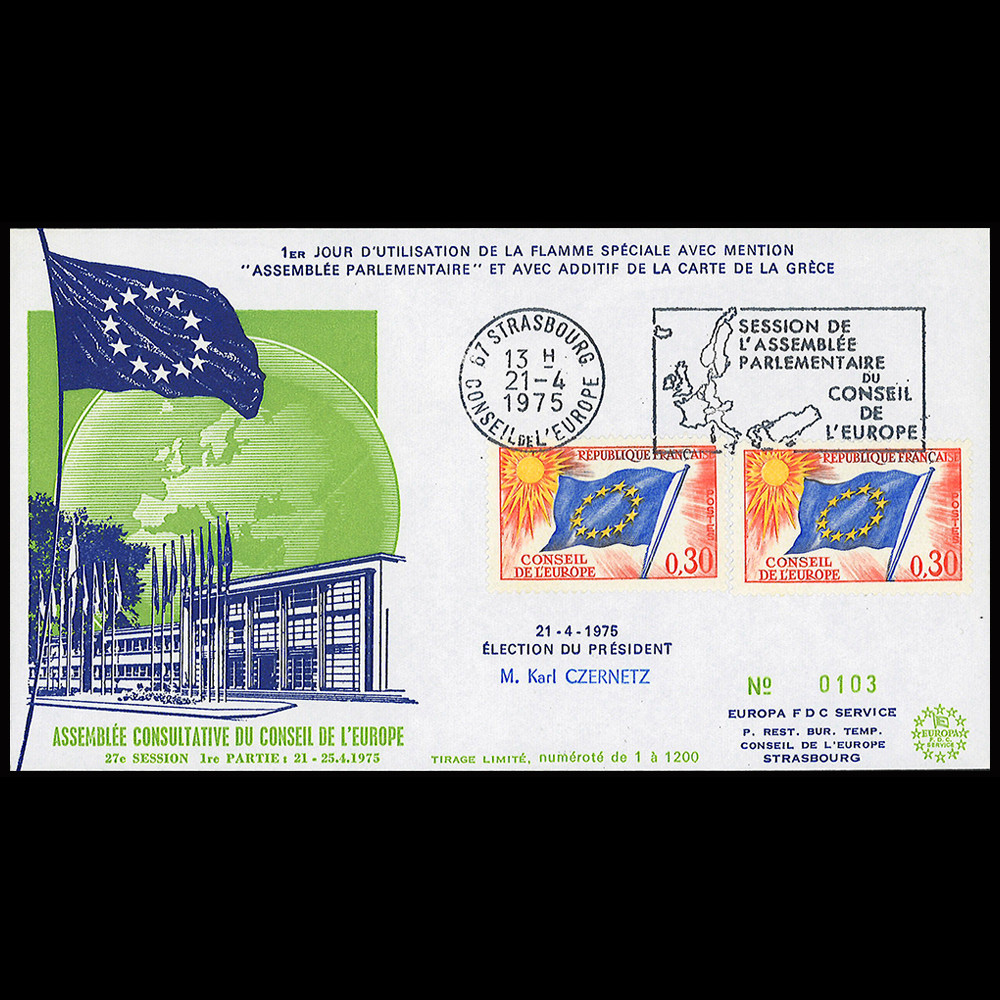 - Oblitération flamme illustrée "Strasbourg Session de l'Assemblée Parlementaire du Conseil de l'Europe (AVEC ADDITIF DE LA CARTE DE LA GRÈCE) 21.04.1975"