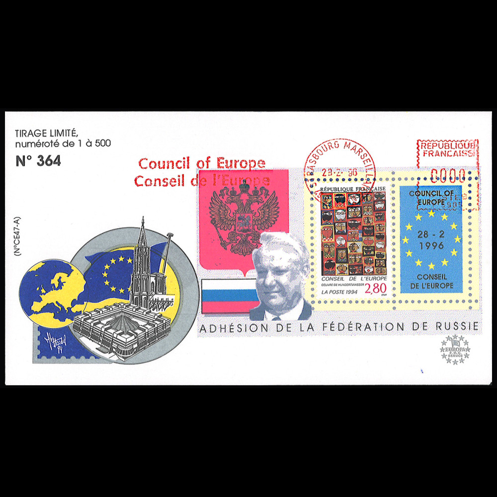 Affranchissement France 1 valeur 2,80F "Conseil de l'Europe, 1994" oblitération flamme Strasbourg "Conseil de l'Europe" 28.2.1996