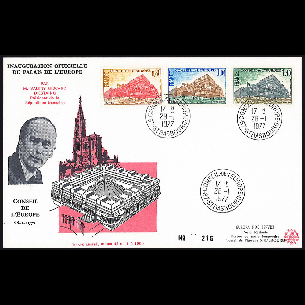 Cette inauguration avait donné lieu à l'émission d'une série de trois timbres de service 'Conseil de l'Europe', oeuvres du graveur Eugène Lacaque, représentant la façade du bâtiment. La ferveur de la population et des philatélistes pour cet événement historique avait provoqué une véritable cohue lors de la mise en vente des souvenirs philatéliques officiels, épuisés en quelques heures.