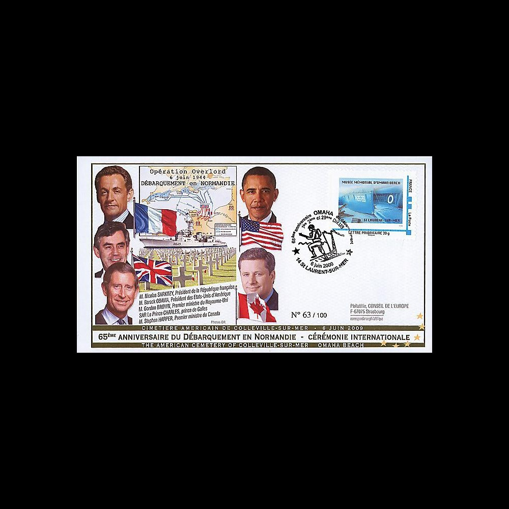 Plis spéciaux '65e anniversaire du Débarquement en Normandie - Cérémonie internationale' au cimetière militaire américain de Colleville-sur-Mer, en présence des présidents américain et français, du Prince de Galles et des Premiers ministres britannique et canadien.
