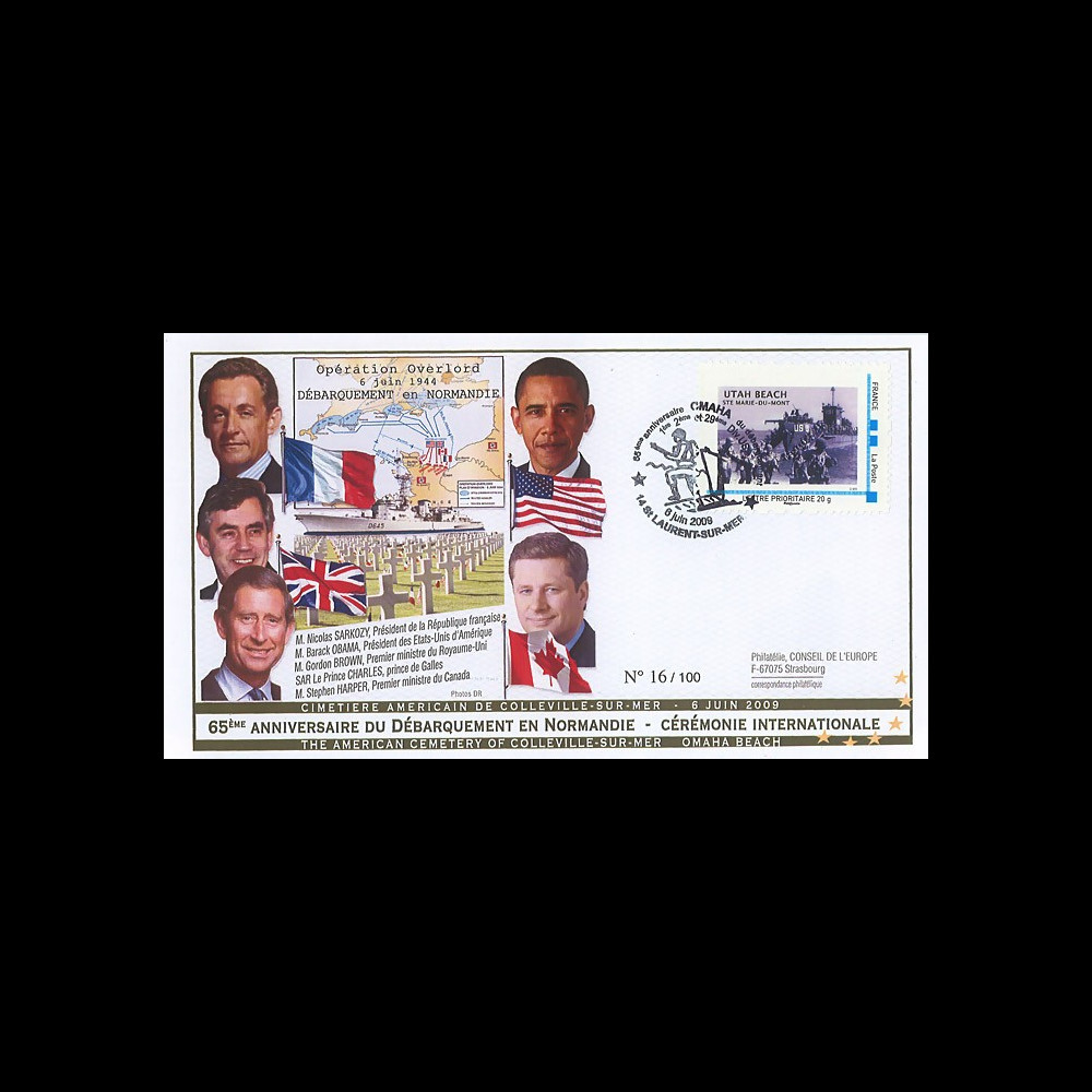 Plis spéciaux '65e anniversaire du Débarquement en Normandie - Cérémonie internationale' au cimetière militaire américain de Colleville-sur-Mer, en présence des présidents américain et français, du Prince de Galles et des Premiers ministres britannique et canadien.