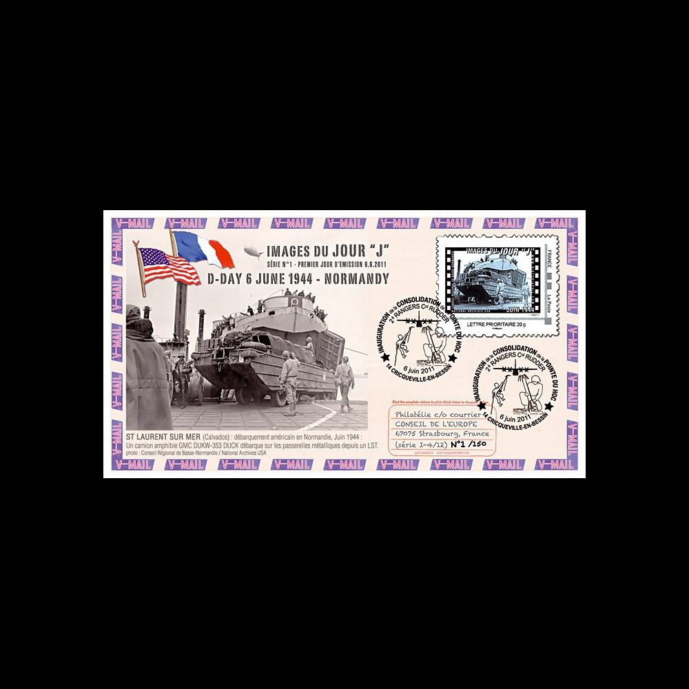 Affranchissement France 1 valeur Timbre-poste personnalisé (TPP) Lettre prioritaire 20g "Images Jour 'J' - Saint-Laurent-sur-Mer (Calvados) Juin 1944 : Un camion amphibie 'DUCK' débarque depuis un LST" oblitération GF Cricqueville "Inauguration de la Consolidation de la Pointe du Hoc" 06.6.2011