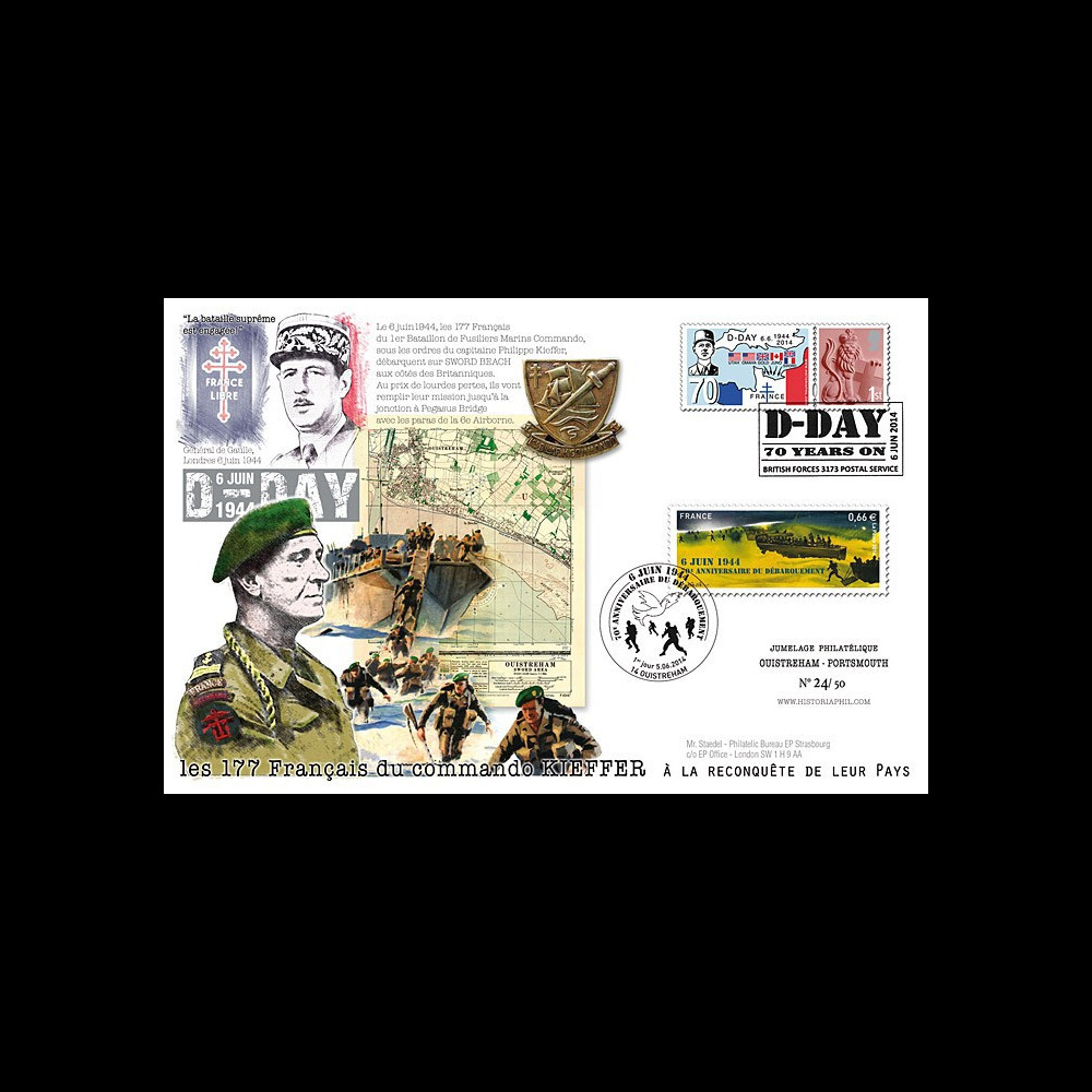 N°DEB14-07 : Maxi FDC FRANCE - ROYAUME-UNI “05.06.2014 : Premier Jour à Ouistreham (France) - 70e anniversaire du Débarquement en Normandie (D-DAY) / 06.06.2014 : Cachet spécial des Postes aux Armées britanniques (Royaume-Uni) - 70 years D-DAY / Commando KIEFFER - SWORD BEACH & Général DE GAULLE / 1939-45 : Deuxième Guerre Mondiale" 2014 :