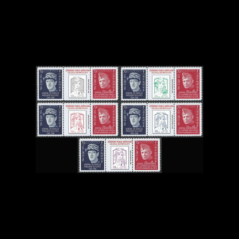 DEB14-04PT1/5 : FRANCE Série de 5 valeurs "Marianne et la Jeunesse, 2014" sur Porte-timbres privés dentelés et gommés "06.06.1944-2014 : Cérémonie Franco-américaine au Cimetière américain de Colleville-sur-Mer (Territoire américain (USA) en France) - 70e anniversaire du Débarquement en Normandie (D-DAY) - Opération OVERLORD / Général DE GAULLE, Président du Gouvernement Provisoire de la République française (1944-46) & Général EISENHOWER "Ike", Commandant Suprême des Forces Expéditionnaires Alliées / 1939-45 : Seconde Guerre Mondiale" 2014 :