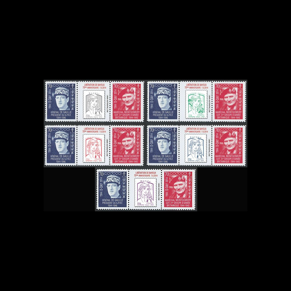 DEB14-11PT1/5 : FRANCE Série de 5 valeurs "Marianne et la Jeunesse, 2014" sur Porte-timbres privés dentelés et gommés "07.06.1944-2014 : 70e anniversaire du Débarquement en Normandie (D-DAY) - Bayeux (France) Première ville de France libérée / Général DE GAULLE, Président du Gouvernement Provisoire de la République française (1944-46) & Maréchal MONTGOMERY "Monty", Commandant 21e Groupe d'Armée britannique (1944-45) / 1939-45 : Seconde Guerre Mondiale" 2014 :