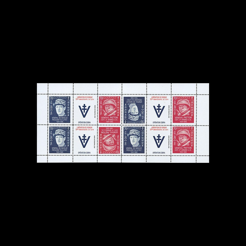 N°DEB14-06FD : Feuillet de 12 vignettes TÊTE-BÊCHE dentelées et gommées "1944-2014 : 70e anniversaire du Débarquement en Normandie (D-DAY) / 29.07.2014 : 70e anniversaire de la Libération de Ronsay (France) - Opération COBRA / Général DE GAULLE, Président du Gouvernement Provisoire de la République française (1944-46) & Général PATTON "Bandito", Commandant 3e Armée américaine U.S. (1944-45) / 1939-45 : Seconde Guerre Mondiale / Croix de Lorraine et V de la Victoire" (ft. 9,7 x 21 cm) 2014 :