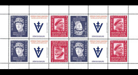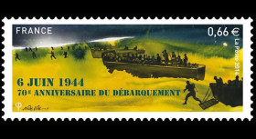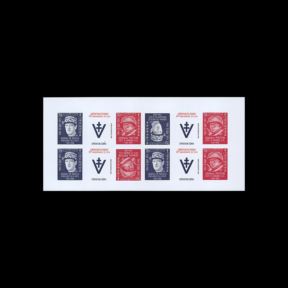N°DEB14-06FND : Feuillet de 12 vignettes TÊTE-BÊCHE gommées et non-dentelées "1944-2014 : 70e anniversaire du Débarquement en Normandie (D-DAY) / 29.07.2014 : 70e anniversaire de la Libération de Ronsay (France) - Opération COBRA / Général DE GAULLE, Président du Gouvernement Provisoire de la République française (1944-46) & Général PATTON "Bandito", Commandant 3e Armée américaine U.S. (1944-45) / 1939-45 : Seconde Guerre Mondiale / Croix de Lorraine et V de la Victoire" (ft. 9,7 x 21 cm) 2014 :