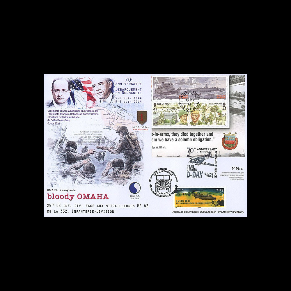 DEB14-13 : Maxi FDC ILE DE MAN (Royaume-Uni) - FRANCE "08.05.2014 : Premier Jour à Douglas (Île de Man) - 70 years D-DAY / 06.06.2014 : Cérémonie Franco-américaine au cimetière américain de Colleville-sur-Mer (France) en présence de M. OBAMA, Président des Etats-Unis et M. HOLLANDE, Président de la République française - 70e anniversaire du Débarquement en Normandie (D-DAY) / OMAHA : La Sanglante : 1ere Division d'Infanterie US - Big Red One & 29e Division d'Infanterie US / Général DE GAULLE & Général EISENHOWER / 1939-45 : Seconde Guerre Mondiale" (ft. 16,2 x 22,9 cm) 2014 :