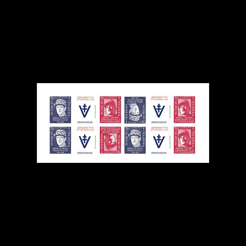N°DEB14-18FND : Feuillet de 12 vignettes TÊTE-BÊCHE gommées et non-dentelées "01.08.2014 : 70e anniversaire du Débarquement de la 2e Division Blindée (2e DB) / 70e anniversaire du Débarquement en Normandie (D-DAY) - Opération OVERLORD / Général DE GAULLE, Président du Gouvernement Provisoire de la République française (1944-46) & Général Philippe LECLERC de HAUTECLOCQUE, Commandant de la 2e Division Blindée / 1939-45 : Seconde Guerre Mondiale / Croix de Lorraine et V de la Victoire" (ft. 9,7 x 21 cm) 2014 :
