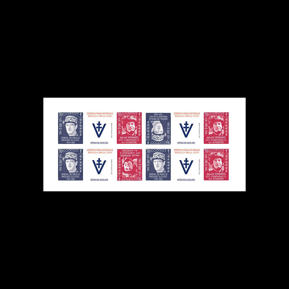 N°DEB14-22FND : Feuillet de 12 vignettes TÊTE-BÊCHE gommées et non-dentelées "05.06.1944-2014 : Cérémonie Franco-britannique de Bénouville et Ranville (Pegasus Bridge & Horsa Bridge, France) - 70e anniversaire du Débarquement en Normandie (D-DAY) - Opération OVERLORD / Général DE GAULLE, Président du Gouvernement Provisoire de la République française (1944-46) & Major John HOWARD, Commandant de la Compagnie D de la 6e Division aéroportée britannique / 1939-45 : Seconde Guerre Mondiale / Croix de Lorraine et V de la Victoire" (ft. 9,7 x 21 cm) 2014 :