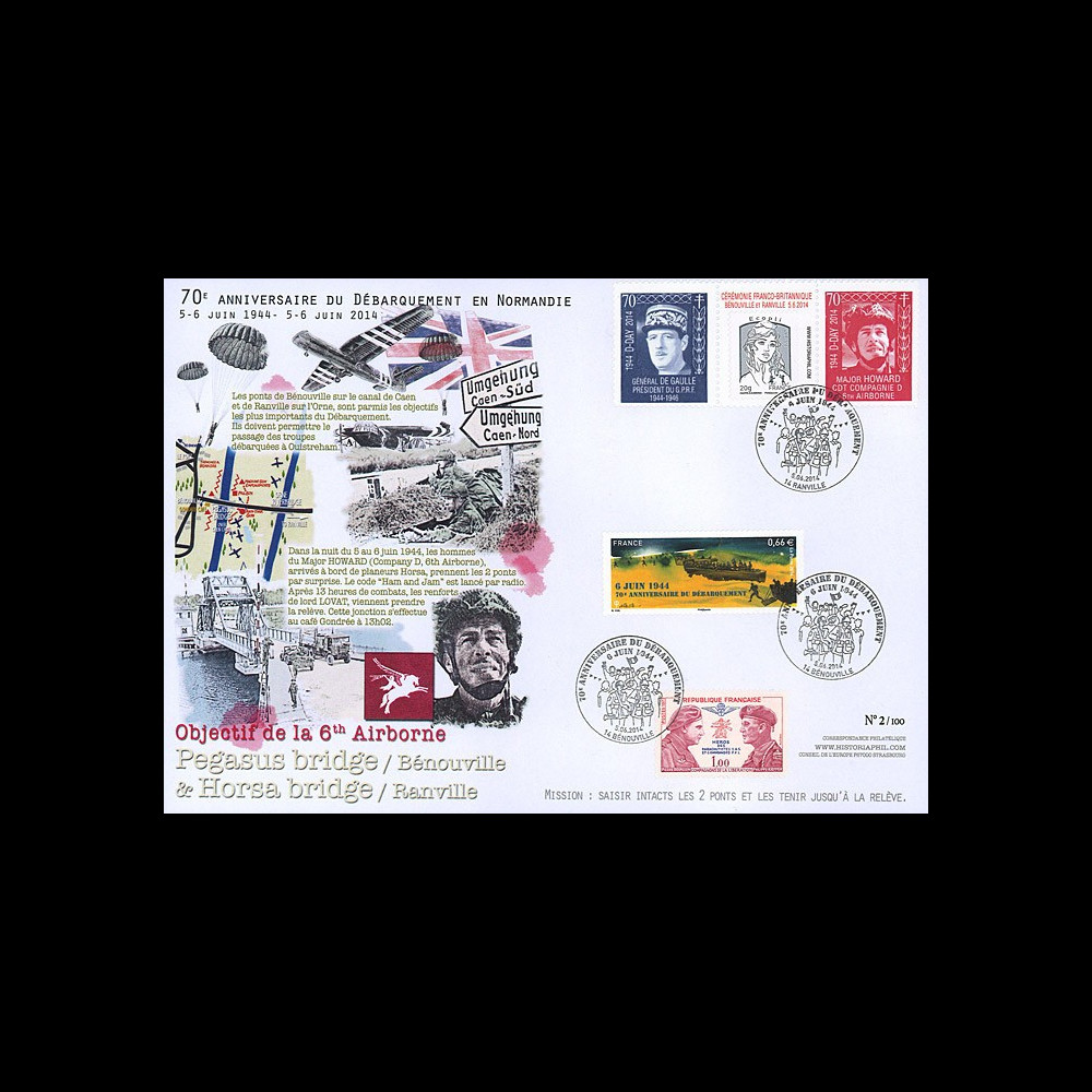 DEB14-22 : Maxi FDC FRANCE "05.06.2014 : Cachet spécial à Bénouville (Pegasus Bridge) - 70 ans Débarquement en Normandie / 05.06.2014 : Cachet spécial à Ranville (Horsa Bridge) - 70 ans Débarquement en Normandie (D-DAY) / Major John HOWARD, Commandant Compagnie D 6e Division aéroportée britannique - Opération Tonga : Saisir et tenir les ponts de Pegasus Bridge & Horsa Bridge intacts jusqu'à la relève / Général DE GAULLE / 1939-45 : Seconde Guerre Mondiale" (ft. 16,2 x 22,9 cm) 2014 :