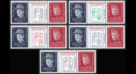 DEB14-20PT1/5 : FRANCE Série de 5 valeurs "Marianne et la Jeunesse, 2014" sur Porte-timbres privés dentelés et gommés "05.06.1944-2014 : Cérémonie Franco-britannique de Merville-Franceville (France) - 70e anniversaire du Débarquement en Normandie (D-DAY) - Opération OVERLORD / Général DE GAULLE, Président du Gouvernement Provisoire de la République française (1944-46) & Sir Winston CHURCHILL, Premier Ministre du Royaume-Uni (1940-45) / 1939-45 : Seconde Guerre Mondiale" 2014 :