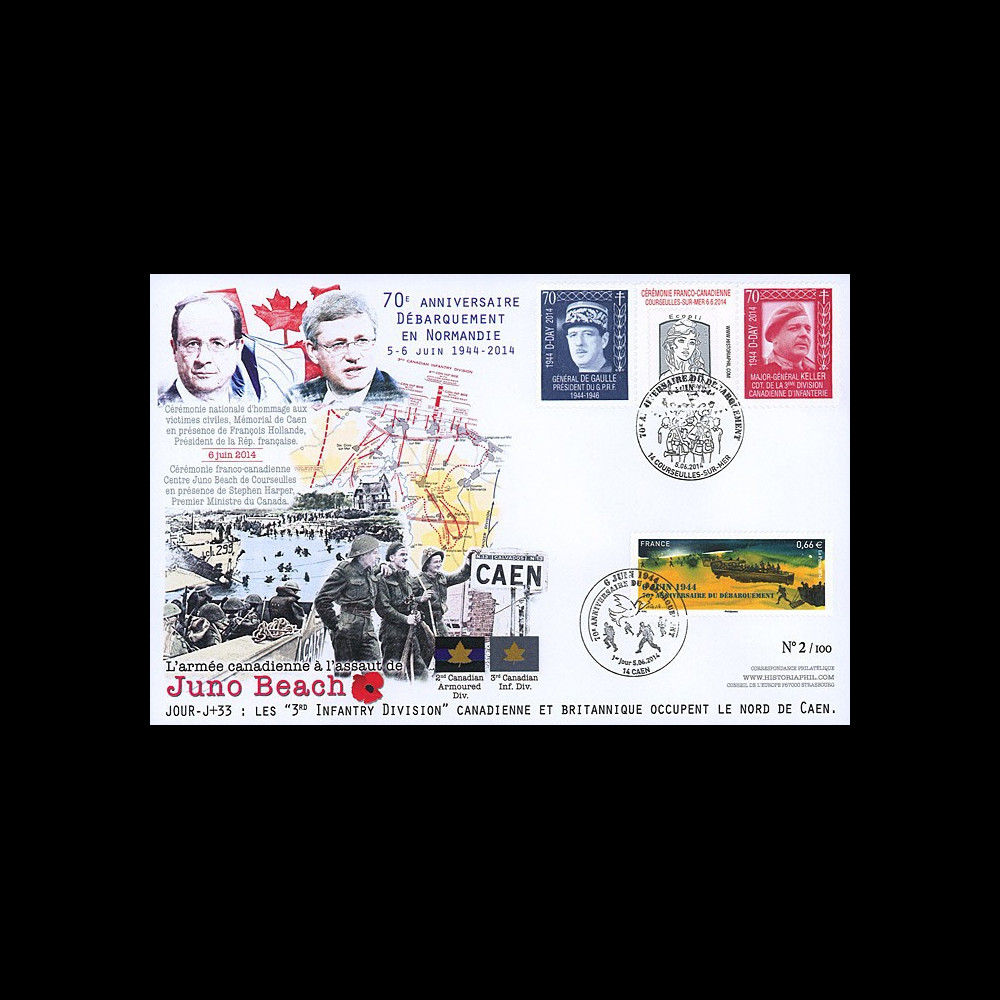 DEB14-19 : Maxi FDC FRANCE "06.06.2014 : Cérémonie Franco-canadienne à Courseulles-sur-Mer (Juno Beach, France) pour le 70e anniversaire du Débarquement en Normandie en présence de M. Stephen HARPER, Premier Ministre du Canada / 06.06.2014 : Cérémonie Nationale à Caen (France) pour le 70e anniversaire du Débarquement en Normandie (D-DAY) en présence de M. François HOLLANDE, Président de la République française / Opération OVERLORD / Général DE GAULLE & Major Général Rodney KELLER, Commandant de la 3e Division Canadienne d'Infanterie / 1939-45 : Seconde Guerre Mondiale" (ft. 13,5 x 20,8 cm) 2014 :