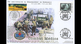 DEB14-30 : Maxi FDC FRANCE "06.06.2014 : Cachet spécial à Vierville-sur-Mer (France) - 70e anniversaire du Débarquement en Normandie (D-DAY) / 09.06.2014 : Cachet spécial à Trévières (France) - 70e anniversaire de la Libération de Trévières / Saint-Jean-de-Daye (Manche, France) Juin 1944 : Un soldat américain sur une Moto Harley-Davidson WLA / 1939-45 : Seconde Guerre Mondiale" (ft. 13,5 x 20,8 cm) 2014 :