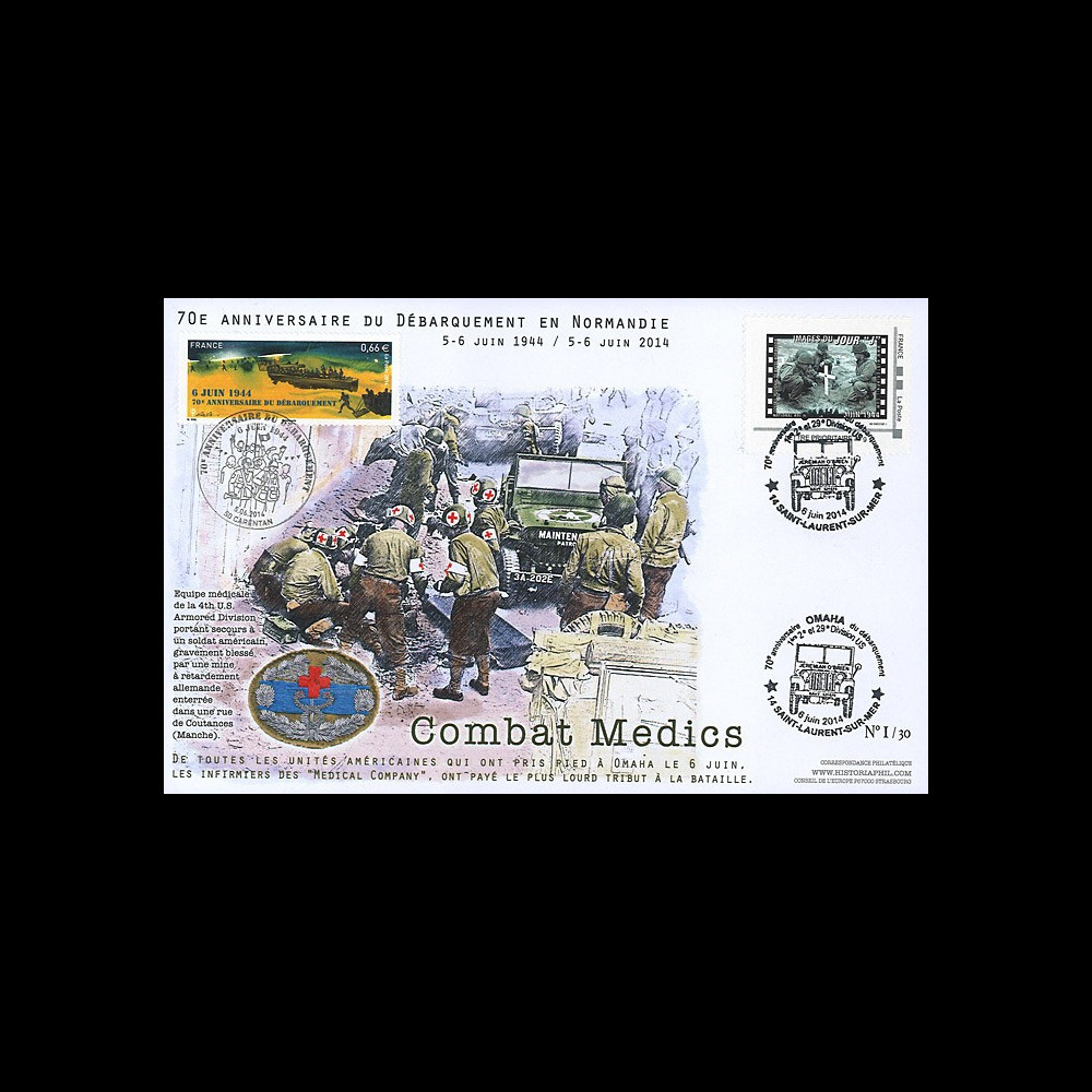 DEB14-32 : Maxi FDC FRANCE "05.06.2014 : Cachet spécial à Carentan (France) - 70e anniversaire du Débarquement (D-DAY) / 06.06.2014 : Cachet spécial à Saint-Laurent-sur-Mer (France) - 70e anniversaire du Débarquement (D-DAY) / OMAHA BEACH : Combat des unités médicales - Les infirmiers des 'Medical Company' - Jeep Willys / 1939-45 : Seconde Guerre Mondiale" (ft. 13,5 x 20,8 cm) 2014 :