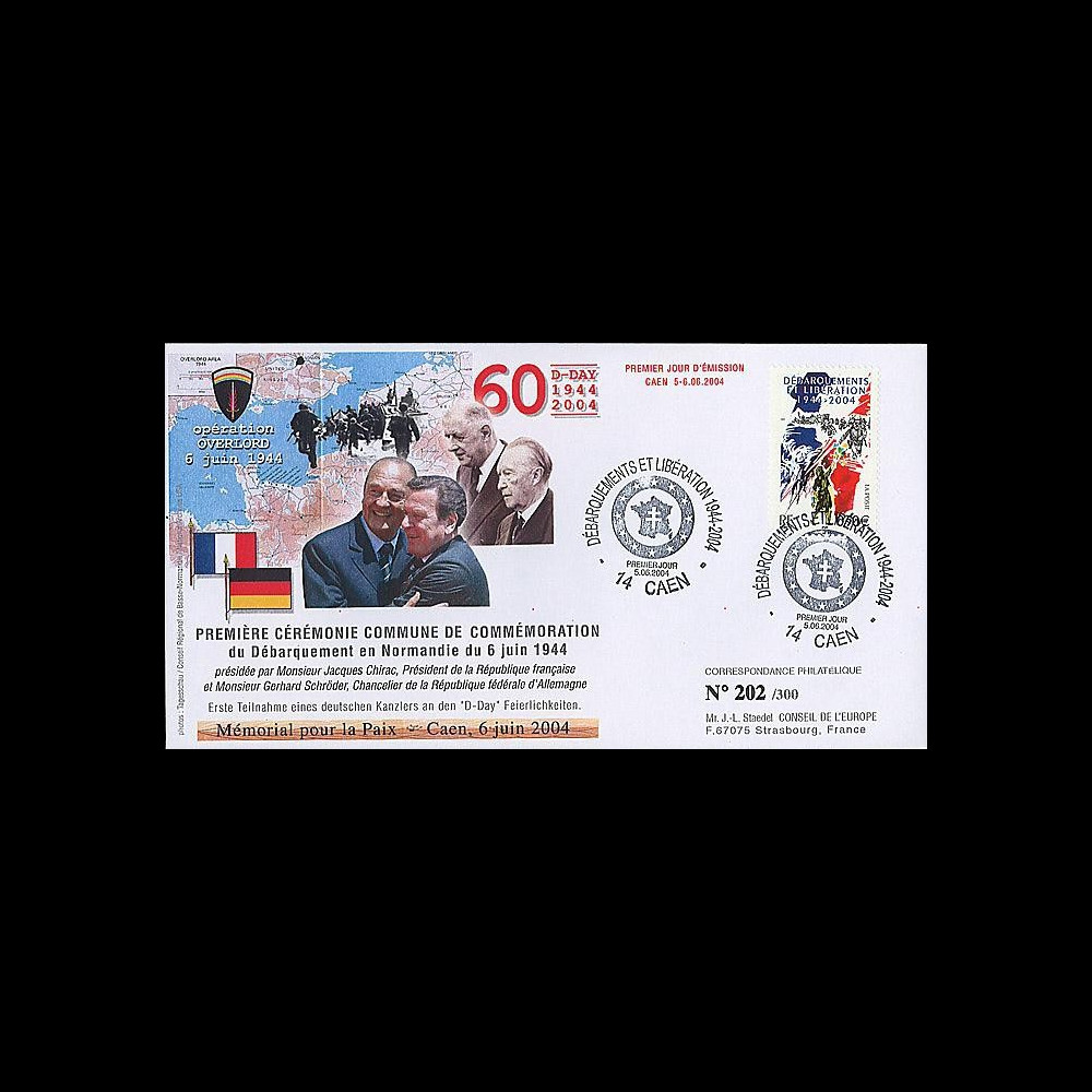 N°DEB04-7 : FDC FRANCE “05.06.2004 : Premier Jour à Caen / D-Day 1944-2004 : 60e anniversaire du Débarquement en Normandie - Première Cérémonie commune de commémoration du Débarquement du 6 Juin 1944 entre M. Jacques CHIRAC, Président de France et M. Gerhard SCHRÖDER, Chancelier de la République Fédérale d'Allemagne à Caen (France)"