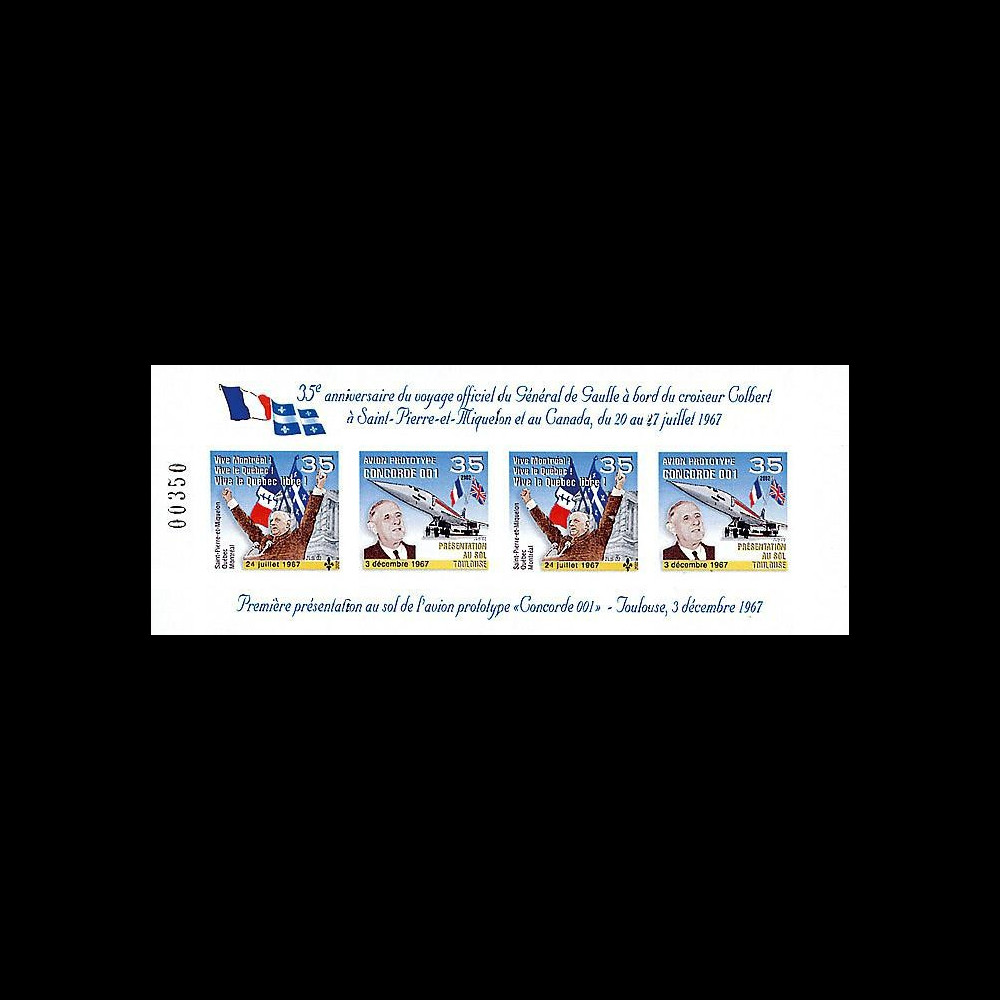 N°DG02qc-1BND: Bloc-feuillet non-dentelé gommé de 4 vignettes «Vive le Québec libre! 1967-2002» / «prototype Concorde 001 1967-2002»