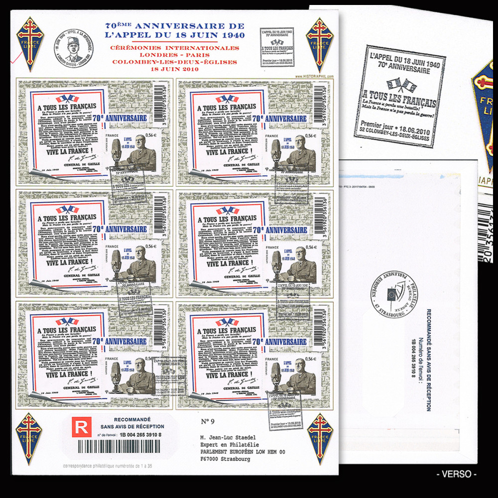 Sur le plan philatélique, la France a émis le 18 juin 2010 un timbre-poste “l’Appel du 18 juin 1940”représentant le général de Gaulle au micro de la BBC. Création et gravure : Claude Jumelet, d’après photos © akg-images. Ce timbre-poste est décliné en deux versions :
