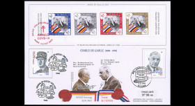 + affranchissement complémentaire France 1 valeur Lettre prioritaire 20g rouge "Marianne et l'Europe, 2013" + 1 valeur 1,00F "5e anniversaire du Mémorial au Général de Gaulle, 1977"