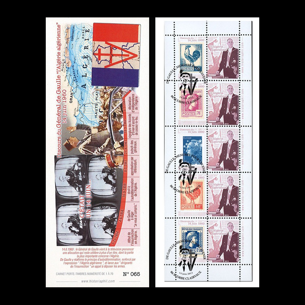 N°DG13-7CT2 : Carnet porte-timbres France 2013 (TYPE 2) "Anniversaire du Discours télévisé du Général DE GAULLE sur l'autodétermination de l'Algérie (l'Algérie algérienne, 14 juin 1960) - 14.06.2013 : Inauguration du Lieu d'Information et d'Exposition permanente 'DE GAULLE, Mémoire pour l'Avenir' à Scorbé-Clairvaux"