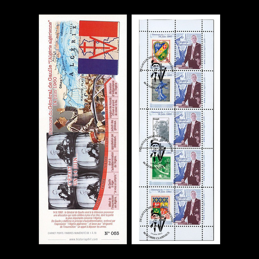 N°DG13-7CT4 : Carnet porte-timbres France 2013 (TYPE 4) "Anniversaire du Discours télévisé du Général DE GAULLE sur l'autodétermination de l'Algérie (l'Algérie algérienne, 14 juin 1960) - 14.06.2013 : Inauguration du Lieu d'Information et d'Exposition permanente 'DE GAULLE, Mémoire pour l'Avenir' à Scorbé-Clairvaux"