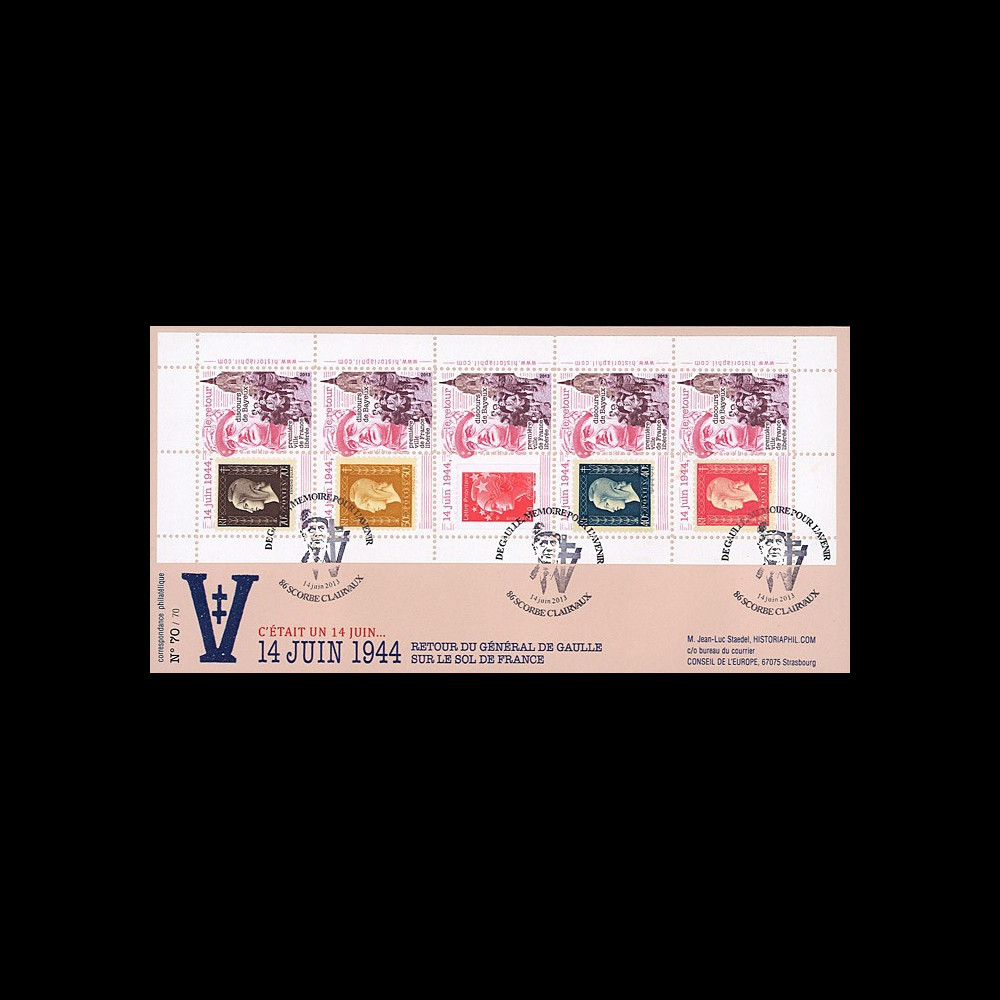 N°DG13-3T1 : Maxi FDC FRANCE "14.06.1944-2013 : 69e anniversaire du retour du Général DE GAULLE sur le sol de France - Discours de Bayeux (France), Première ville de France libérée - Seconde Guerre Mondiale 1939-45 / 14.06.2013 : Inauguration du Lieu d'Information et d'Exposition permanente 'DE GAULLE, Mémoire pour l'Avenir' à Scorbé-Clairvaux (France)" (TYPE 1) 2013 :