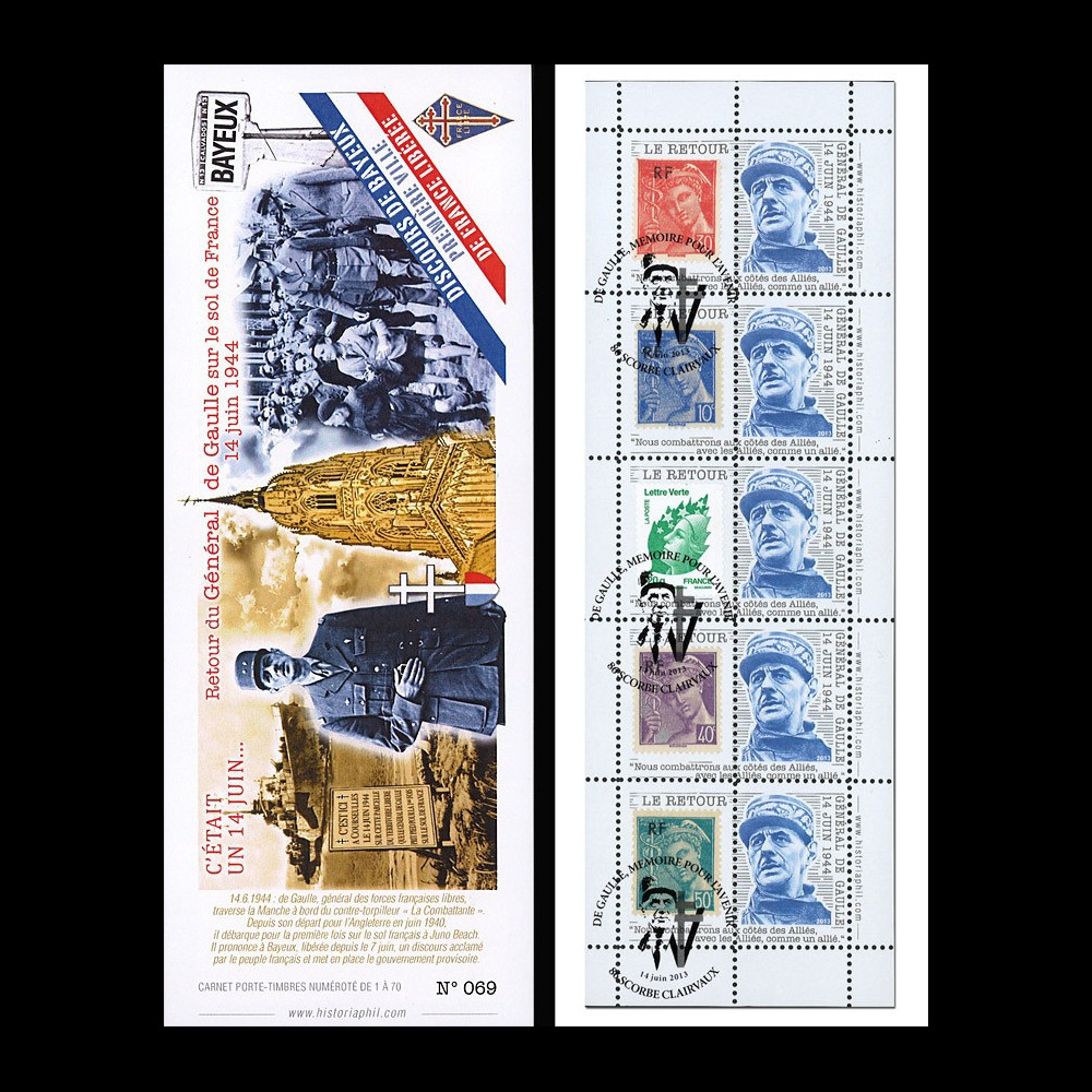 N°DG13-4T4 : Carnet porte-timbres privé "14.06.1944-2013 : 69e anniversaire du retour du Général DE GAULLE sur le sol de France : 'Nous combattrons aux côtés des Alliés, avec les Alliés, comme un Allié' - Discours de Bayeux (France), Première ville de France libérée - Seconde Guerre Mondiale 1939-45 / 14.06.2013 : Inauguration du Lieu d'Information et d'Exposition permanente 'DE GAULLE, Mémoire pour l'Avenir' à Scorbé-Clairvaux (France)" (TYPE 4) 2013 :