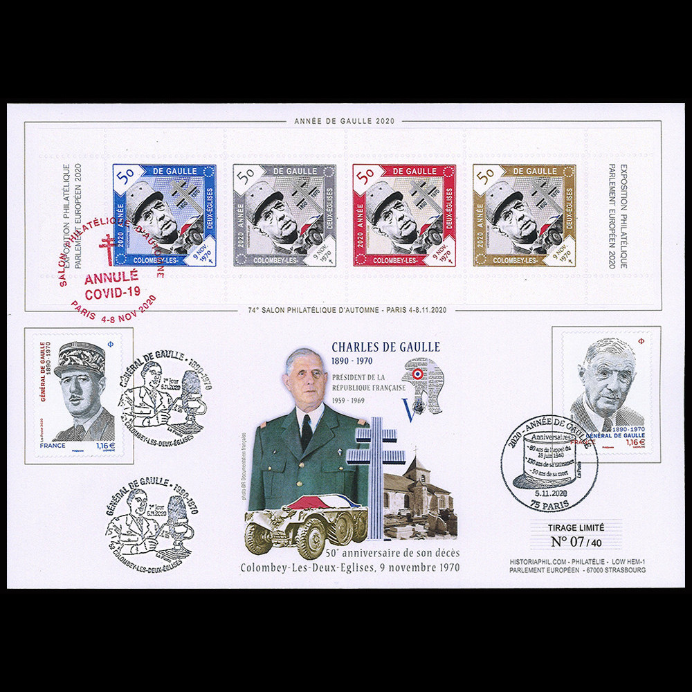 De ce fait, la mise en vente anticipée des timbres-poste "2020 ANNÉE DE GAULLE" et les oblitérations "Premier Jour" du Salon Philatélique d'Automne de Paris, ont exceptionnellement été traitées depuis l'Imprimerie des Timbres-Poste à Boulazac. Un cachet rouge privé "Salon Philatélique d'Automne - ANNULÉ (virus)" a été apposé uniquement sur nos documents philatéliques.