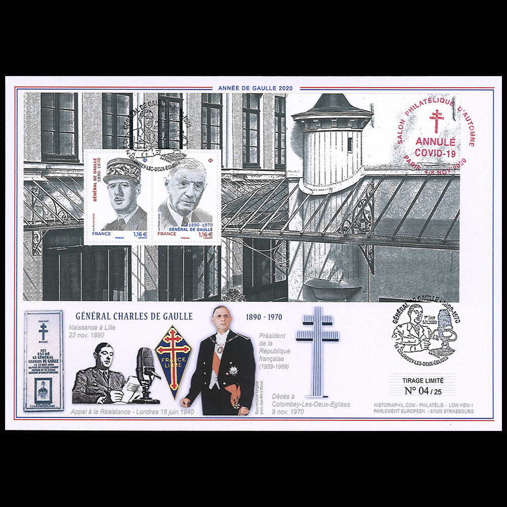 De ce fait, la mise en vente anticipée des timbres-poste "2020 ANNÉE DE GAULLE" et les oblitérations "Premier Jour" du Salon Philatélique d'Automne de Paris, ont exceptionnellement été traitées depuis l'Imprimerie des Timbres-Poste à Boulazac. Un cachet rouge privé "Salon Philatélique d'Automne - ANNULÉ (virus)" a été apposé uniquement sur nos documents philatéliques.