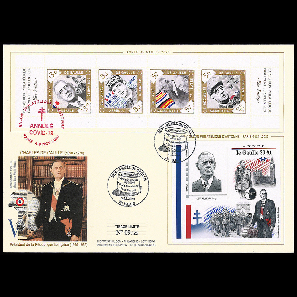 De ce fait, la mise en vente anticipée des timbres-poste "2020 ANNÉE DE GAULLE" et les oblitérations "Premier Jour" du Salon Philatélique d'Automne de Paris, ont exceptionnellement été traitées depuis l'Imprimerie des Timbres-Poste à Boulazac. Un cachet rouge privé "Salon Philatélique d'Automne - ANNULÉ (virus)" a été apposé uniquement sur nos documents philatéliques.