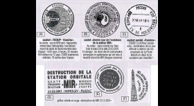 Quelques enveloppes astrophilatéliques numérotées, oblitérées de Korolev (Russie) et revêtues des deux rarissimes cachets officiels "destruction de MIR" réalisés en dernière minute au TSOUP, sont les témoins de cet événement historique. Des timbres d'ex-URSS avaient également été surchargés spécialement à l'effigie de "Youri Gagarine, Premier Homme Soviétique dans l'Espace" et "Les records de MIR".
