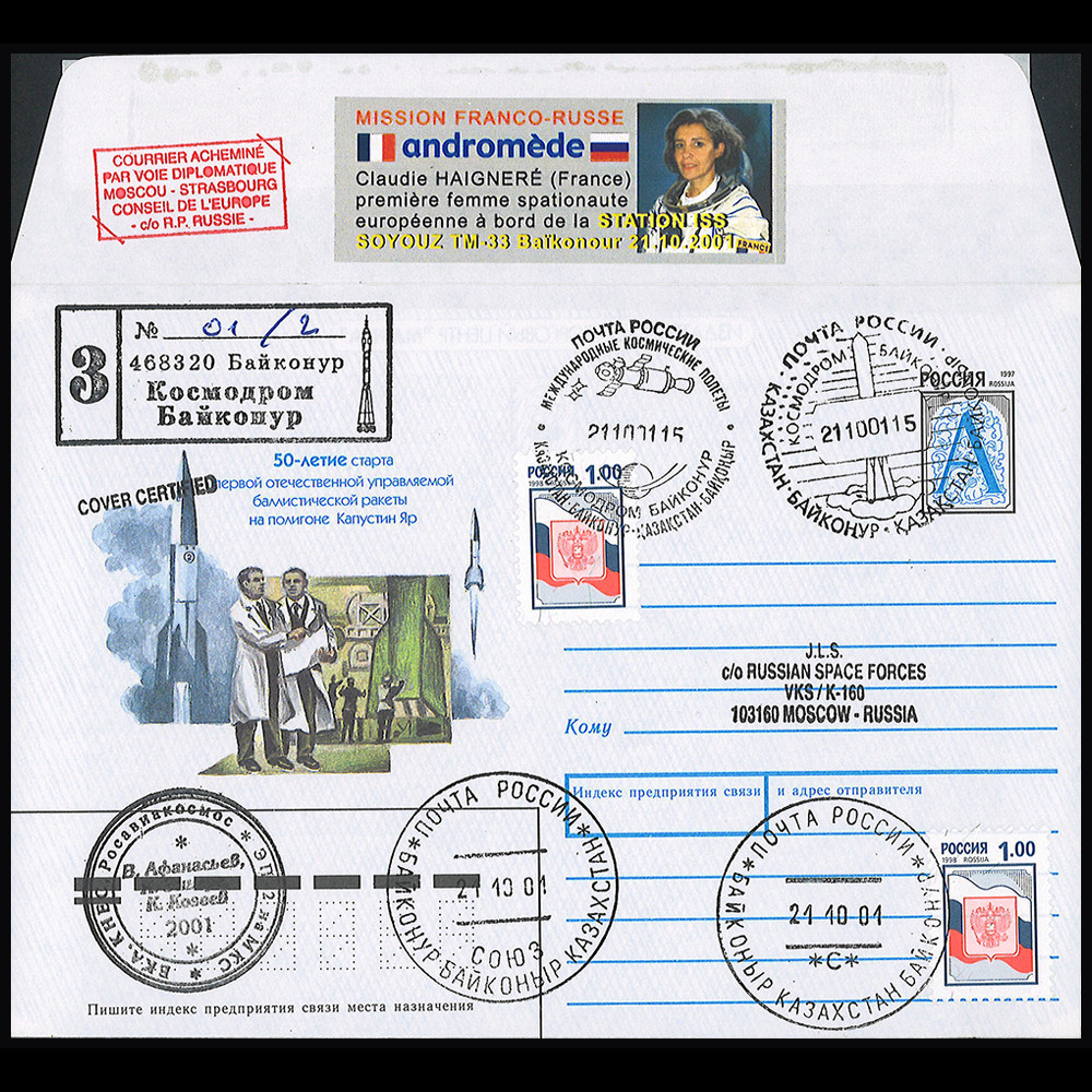 N°TM33-D : Entier postal (enveloppe) ex-URSS ‘50 ans 1ère fusée balistique russe’ / “SOYOUZ TM-33 Mission Franco-Russe ANDROMÈDE 21-31.10.2001 - Claudie Haigneré (France), première femme spationaute européenne à bord de la Station ISS“