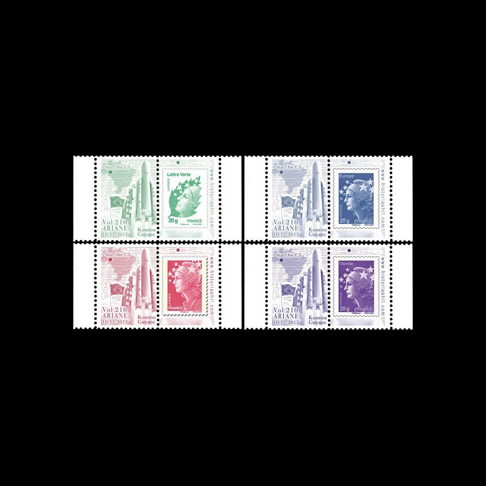 N°VA210L-PT1/4 : série de 4 porte-timbres dentelés et gommés “Vol 210 Ariane 10.11.2012 - Star One C3 (Brésil)“