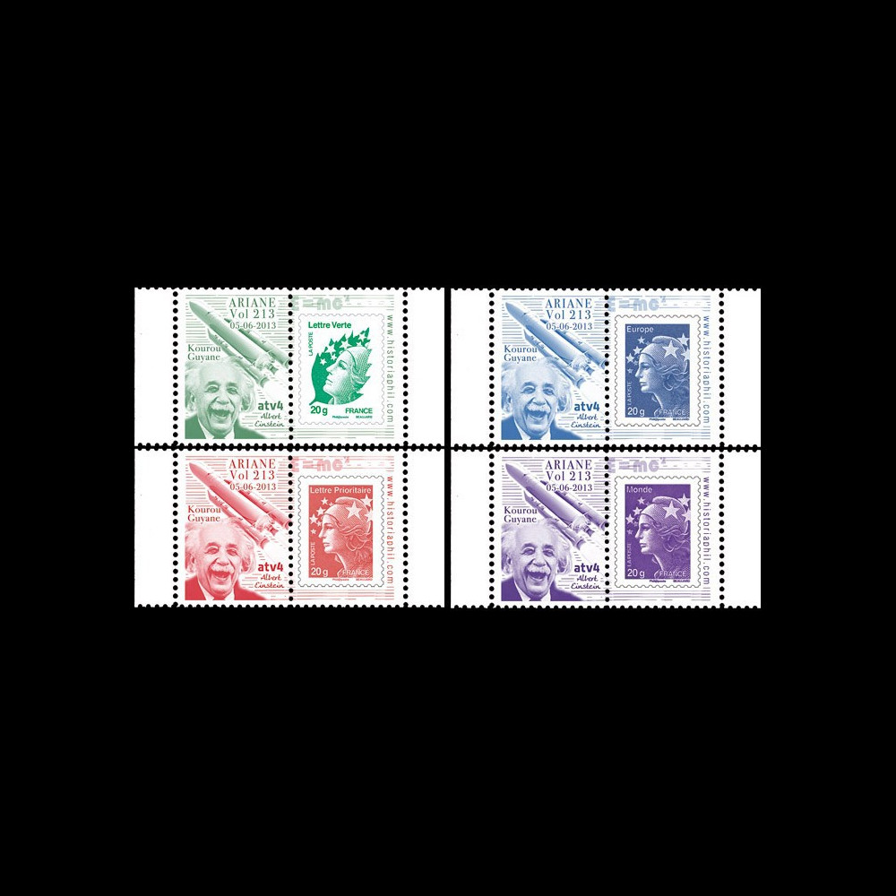 N°VA213L-PT1/4 : série de 4 porte-timbres dentelés et gommés “Vol 213 Ariane 05.06.2013 - véhicule automatique de transfert européen ATV 4 'Albert Einstein'“