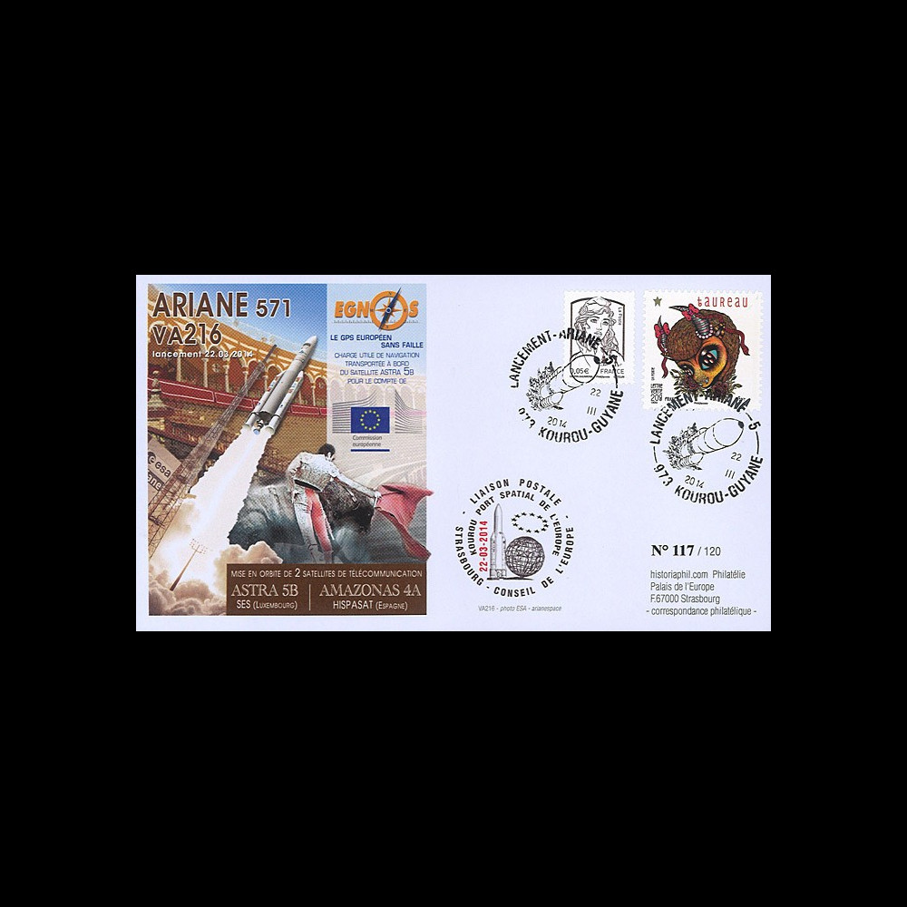 N°VA216L-T2 : FDC KOUROU (Guyane française) "22.03.2014 : Lancement Fusée ARIANE 5 ECA - Version 571 - Vol n°216 / Mise en orbite du satellite de télécommunication ASTRA-5B (SES, Luxembourg pour le compte de la Commission européenne) et du satellite de télécommunication AMAZONAS-4A (Hispasat, Espagne)" (TYPE 2) 2014 :