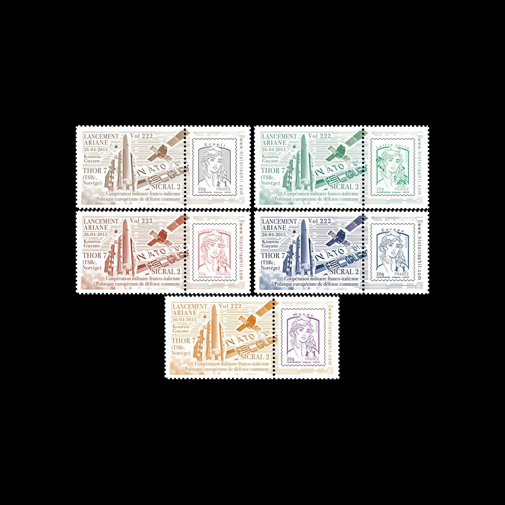 N°VA222L-PT1/5 : FRANCE - Série de 5 valeurs "Marianne et la Jeunesse, 2015" sur Porte-timbres privés dentelés et gommés "26.04.2015 : Lancement Fusée ARIANE 5 ECA - Version 576 - Vol n°222 / Mise en orbite du satellite de télécommunications militaires SICRAL-2 (Ministère de la Défense italienne & DGA française) et du satellite de télécommunications THOR-7 (Telenor Satellite Broadcasting - TSBc, Norvège) / OTAN - NATO" 2015 :