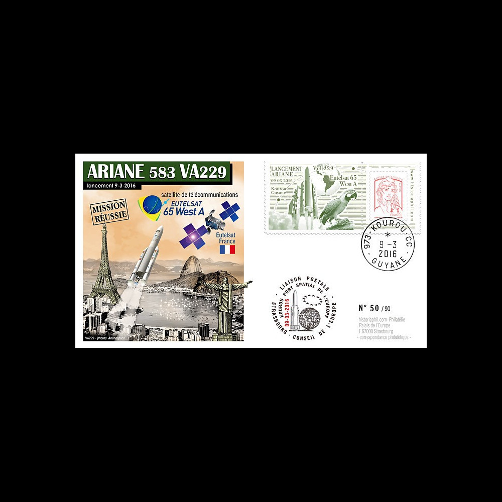 N°VA229L-T1 : FDC KOUROU (Guyane française) "09.03.2016 : Lancement Fusée ARIANE 5 ECA - Version 583 - Vol n°229 / Mise en orbite du satellite de télécommunications EUTELSAT 65 West A (Eutelsat, France)" (TYPE 1)
